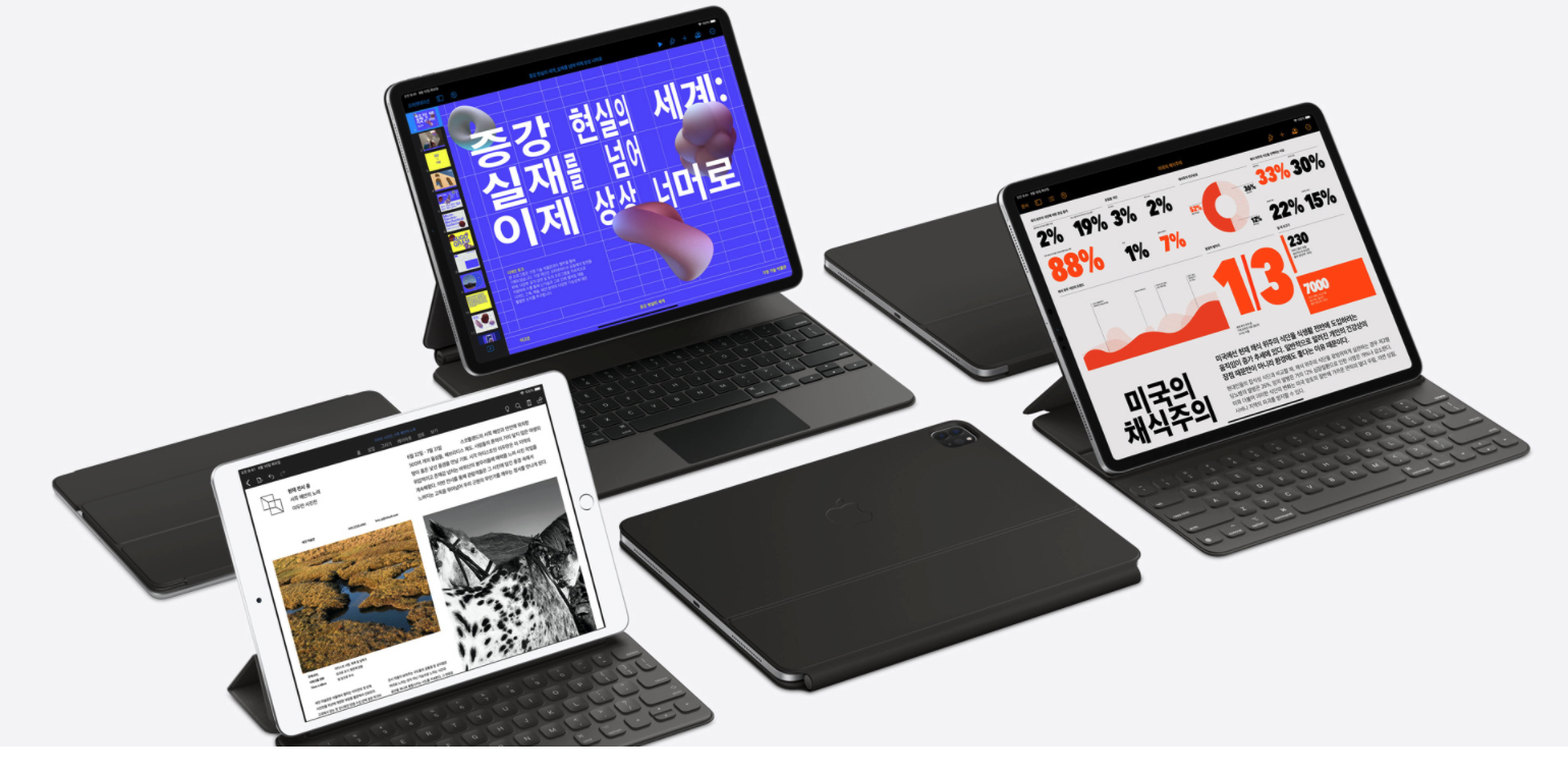애플이 최근 '매직 키보드(Magic Keyboard)'라는 걸 발표했어요. 2019년에 발매된 아이패드 프로 모델(12.9인치 3세대와 4세대, 11인치 1세대와 2세대)에만 사용할 수 있는, 새로운 키보드입니다. 최신 맥북에 적용된 가위식 키보드에 마우스를 대용할 수 있는 트랙패드(터치패드)를 붙인 제품이에요. 매직 키보드를 발표함과 동시에 새로운 iPadOS 버전에서 마우스와 트랙패드를 공식 지원하기 시작했죠. 각도를 자유롭게 조절할 수 있는 디자인도 인상적이었어요. 심지어 USB-C 포트를 넣어주기까지 했어요. 게다가 백라이트(키에 불빛이 들어오는 기능)까지 넣었다니까요. 매직 키보드와 함께라면, 아이패드 프로는 더욱더 노트북에 가까워지는 셈입니다. 물론, 애플의 다른 아이패드 정품 키보드처럼 덮개를 겸용해요. 훨씬 견고하고, 훨씬 비쌉니다. 2020년 5월 발매 예정이에요.