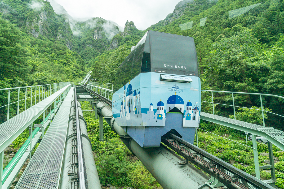 걸어서는 30여 분이 걸렸을, 그것도 오르막길을 꼬박 올라서 가야 했을 길을, 이 모노레일을 이용하면 2분 만에 환선굴에 닿을 수 있었다. 경사각이 상당한 것을 보니, 누군가에게는 스릴 혹은 공포를 선사했을지도 모르겠다. 모노레일은 덜컹거리며 덕항산을 올랐다. 신선계로 조금씩 들어서는 순간이었다.