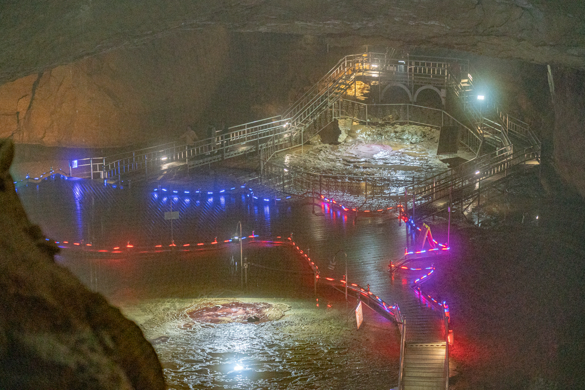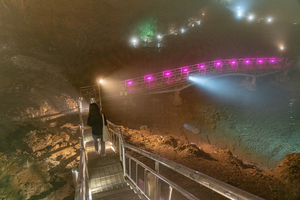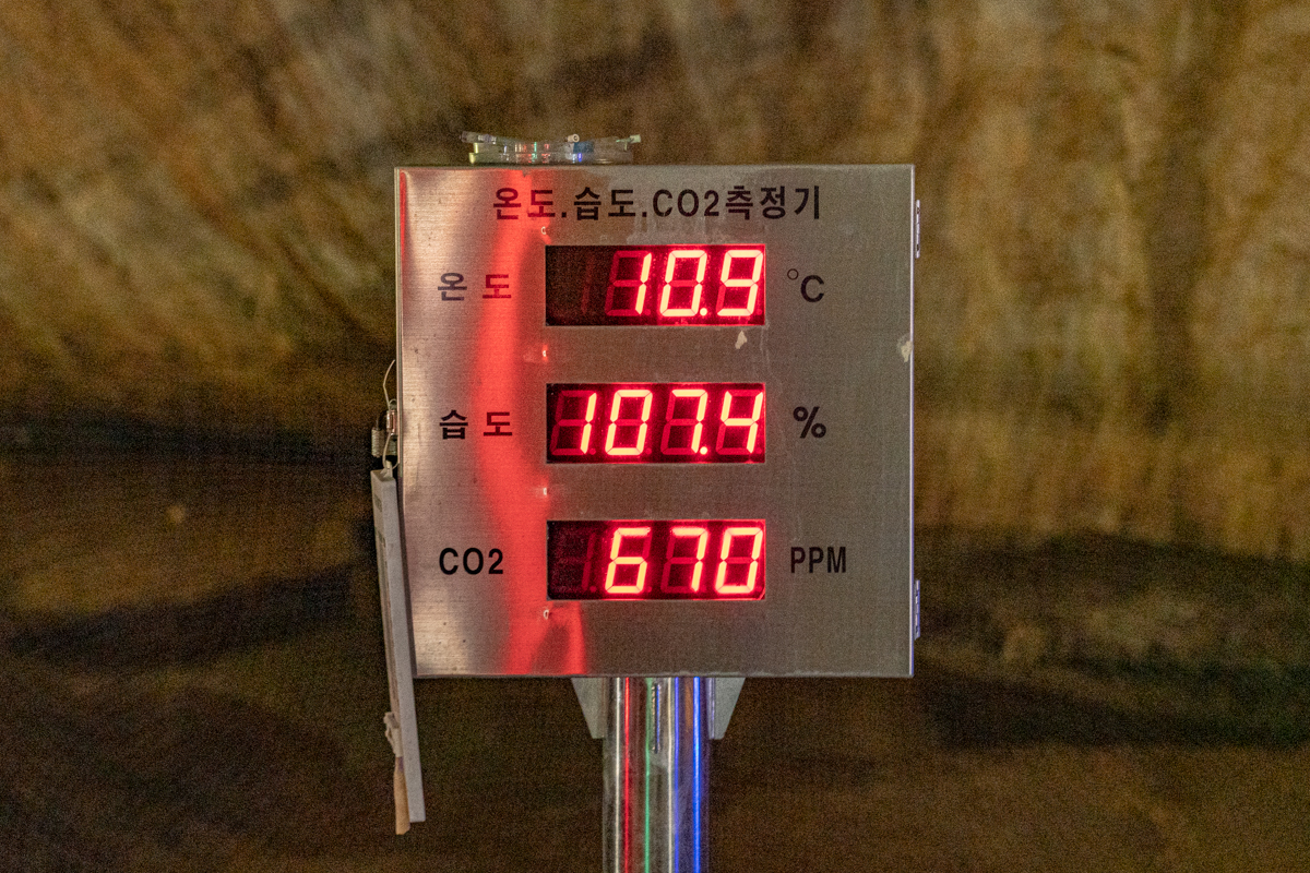 산을 뒤덮었던 안개는 환선굴 입구에서도 여전했다. 여기부터는 정말이지 인간 세계가 아닌 것만 같았다. 씩씩하게 들어서는 친구의 뒤를 따랐다. 안개는 동굴 특유의 높은 습도와 어우러지며 더욱더 짙어지고 있었다. 영화 '미스트'의 한 장면이 떠올랐다. 한 치 앞도 제대로 볼 수 없는 상황이 펼쳐졌다. 그나마 화려한 조명이 우리를 감싸고 있어 다행이었다. 탐방로 옆에 놓인 온도계는 섭씨 10도를 가리켰다.