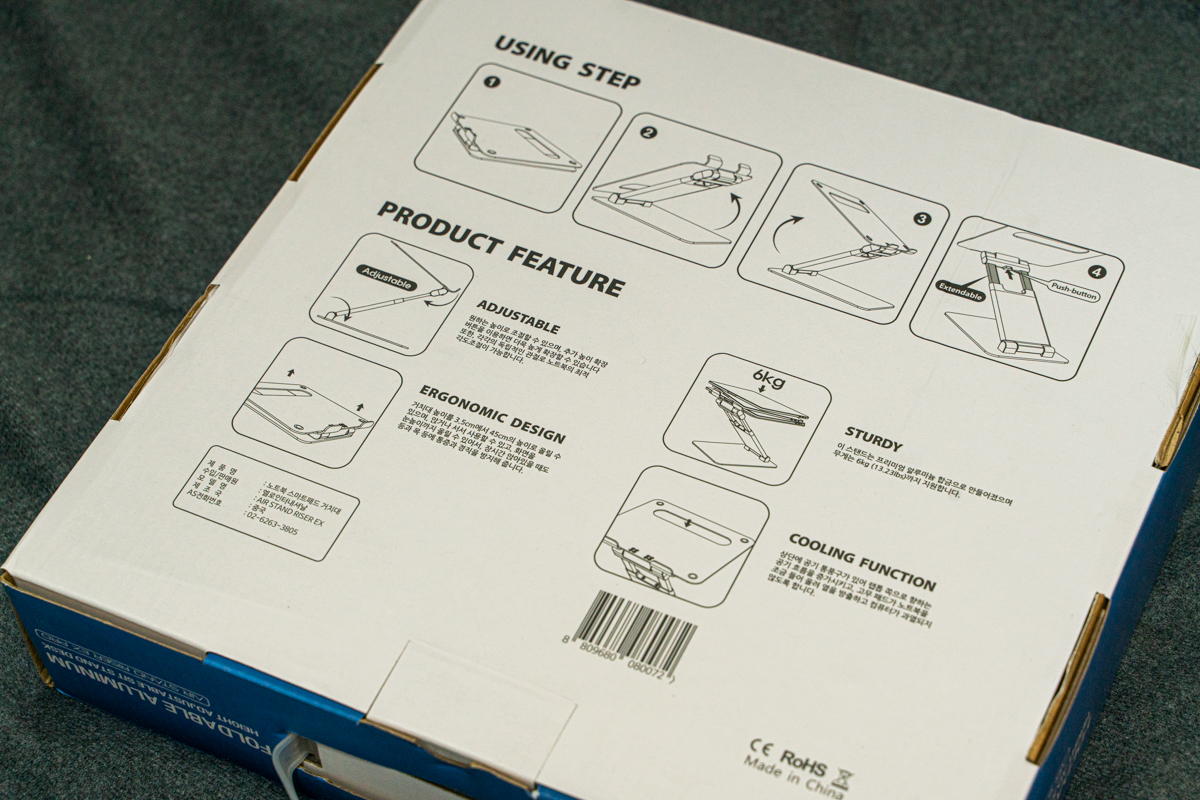 박스 뒷면에는 사용 방법이 담겨 있다. 영어와 한국어로. 원하는 각도로 거치대를 펴서 자리에 두고, 그 위에 노트북을 올리면 된단다.
