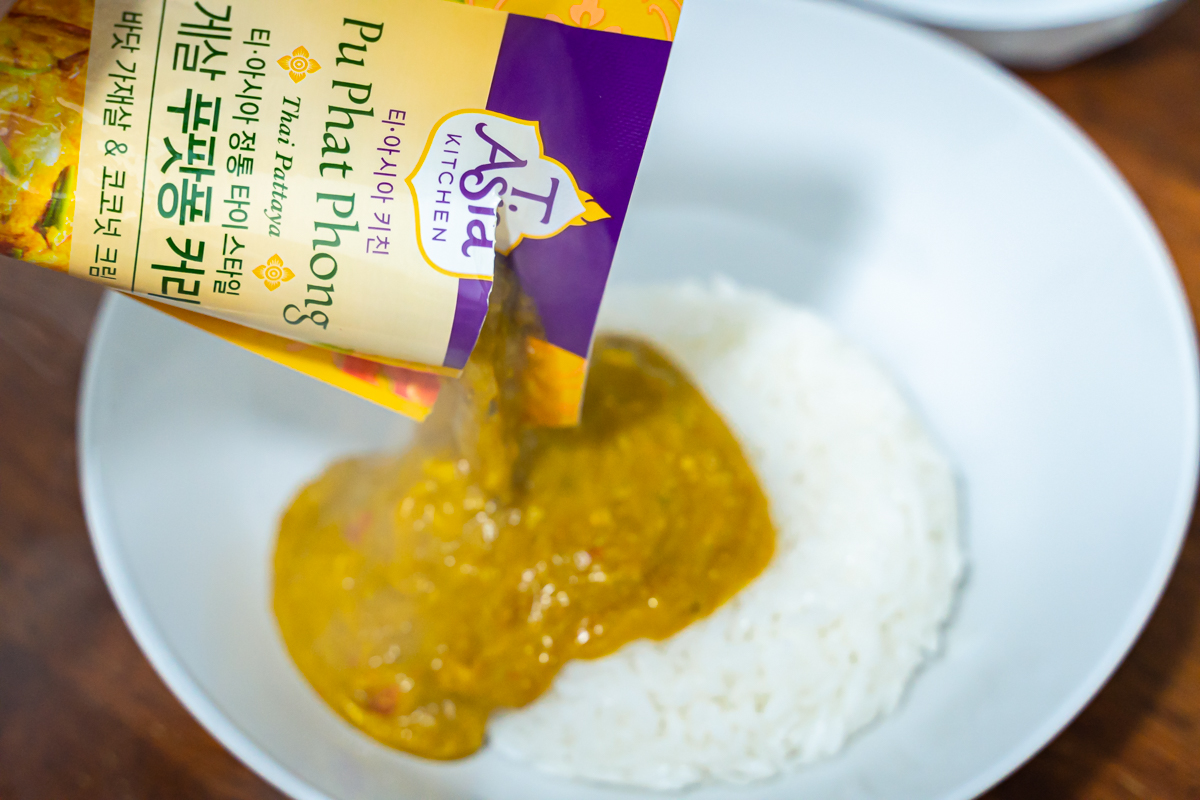 매번 식당에서 먹는 것도 사실 쉬운 일이 아니에요. 집과 작업실만 오가고 있는 것은 물론이고, 두 곳에서 전부 밥을 지어 먹고 있으니까요. 그렇다고 푸팟퐁커리를 직접 만들 수도 없는 노릇이에요. 번거롭잖아요.