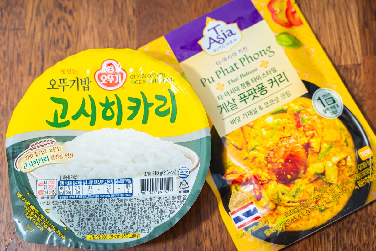 지인피셜로는 햇반보다 맛이 덜하다는 오뚜기밥(사실 저는 잘 모르겠어요)과 푸팟퐁커리를 함께 맛보려면 전자레인지만 있으면 됩니다. 자취생들에게 이보다 더 간단하면서도 화려한 식단이 또 어디에 있겠어요. 적당히 뜯어서 전자레인지에 돌려줍니다. 두 개 합쳐놓고 보니까 칼로리가 어마어마하네요. 315kcal + 220kcal라니.
