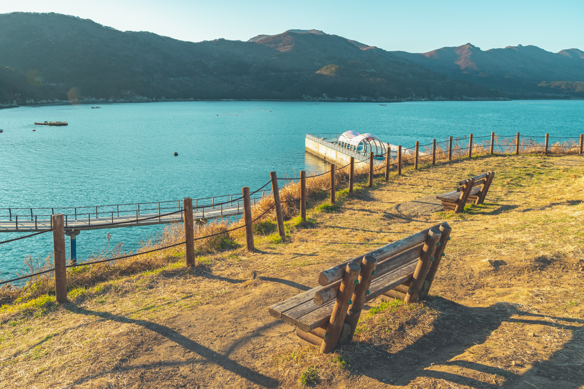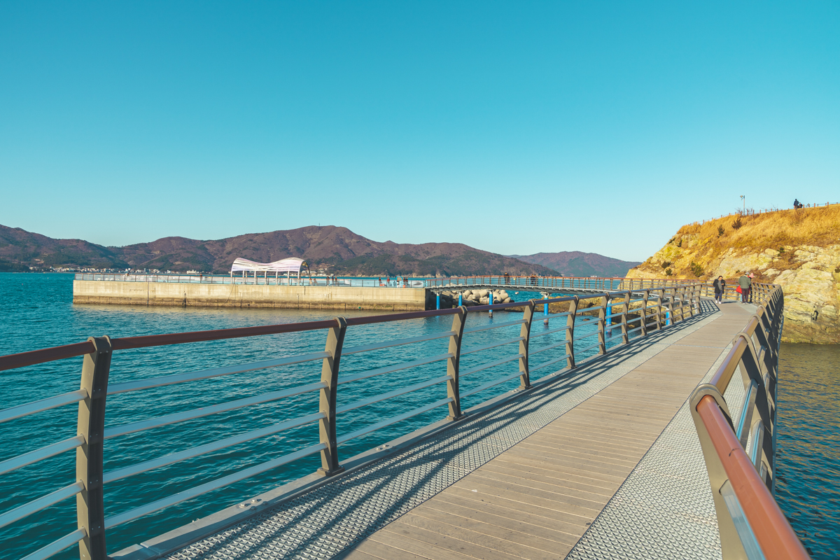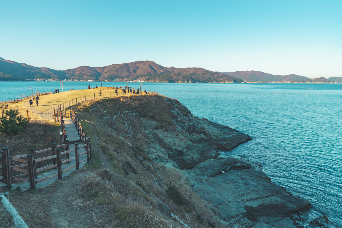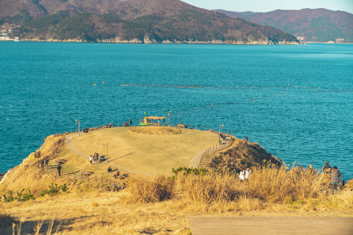 이번에는 거제도에 있는 바람의 언덕입니다. 해금강 인근, 도장포의 한 해안 언덕을 바람의 언덕이라고 부르는데요. 20여 년 전 영화와 드라마 촬영지로 유명했던 곳이에요. 2009년에는 이곳에 풍차를 설치하기도 했죠. 진짜 풍차는 아니고 조형물이에요. 둥글게 솟은 언덕이 상당히 독특한 지형을 만들어내고 있어서, 산책하거나 주변 풍경을 감상하기에도 좋습니다. 언덕 뒤로는 약간 등산 느낌의 산책로가 있기도 한데, 요즘 같은 시기라면 이곳에서 동백을 만나볼 수도 있습니다.