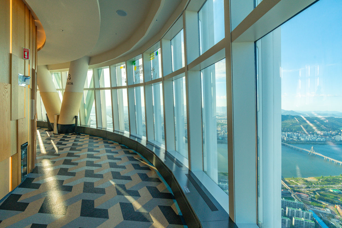 117층이 서울 스카이 전망대, ‘스카이 데크’의 입구다. 통유리 너머로 시원하게 펼쳐지는 서울의 풍경을 처음 만나게 되는 공간이다. 잠실대교, 잠실철교, 올림픽대교가 중심이 되어 좌우로 한강이 뻗어 나간다. 롯데월드를 포함해 서울 전역을 한눈에 조망할 수 있다. 저 멀리 남한산성이, 날씨가 좋다면 서해와 함께 북한 지역까지도 어렴풋이 볼 수 있다고 한다.