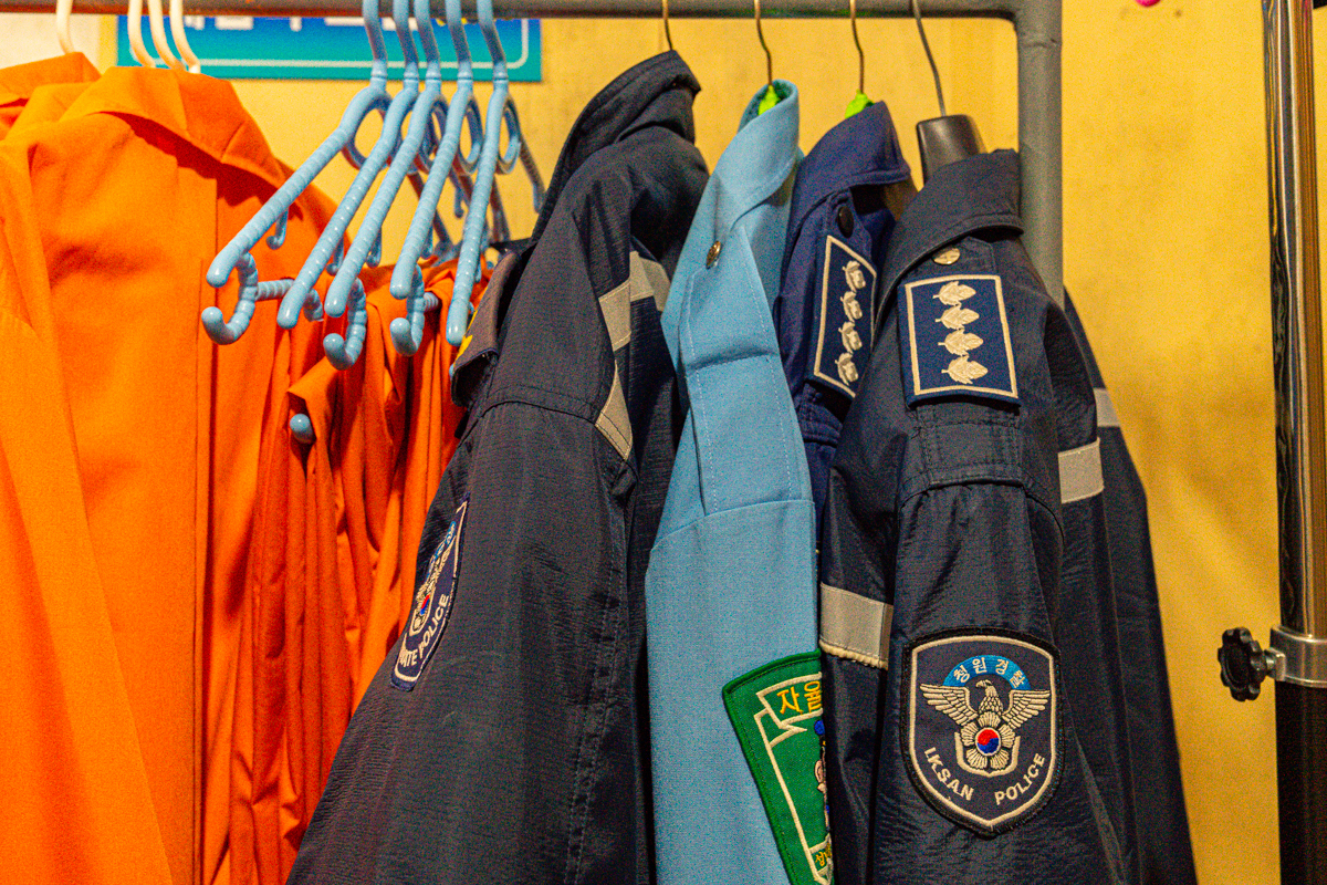 익산 교도소세트장에는 코스튬 체험을 할 수 있도록, 여러 복장이 준비되어 있습니다. 재판 중인 미결수가 입는 주황색 죄수복, 기결수가 입는 파란색 죄수복을 남녀 사이즈에 맞게 갖추고 있죠. 교도관도 되어볼 수 있습니다. 교도관이 입는 유니폼과 수갑, 봉, 밧줄 등도 다양하게 준비되어 있거든요. 의상 체험, 무료입니다. 옷을 갖춰 입고 기념 사진을 남겨보세요.