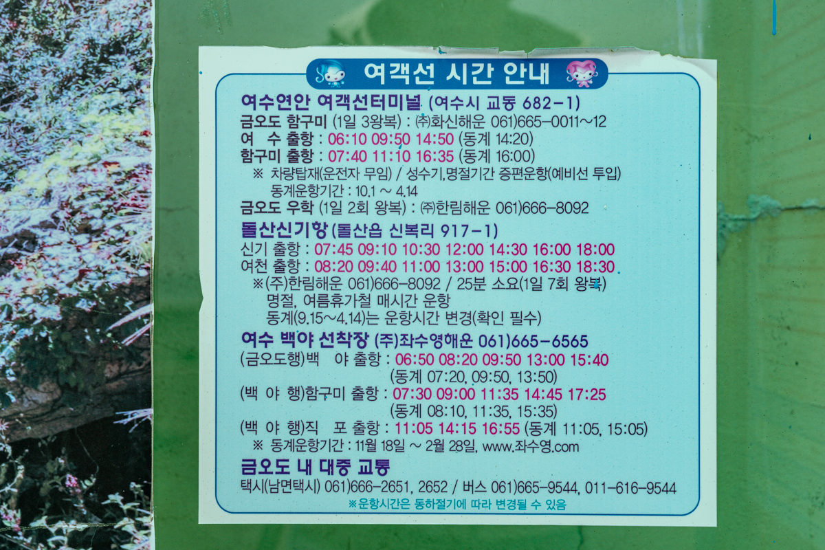 - 금오도 마을버스는 수요에 따라 움직입니다. 자세한 정보는 버스 업체에 전화로 문의하셔야 합니다. (061-665-9544 / 010-6314-9544)