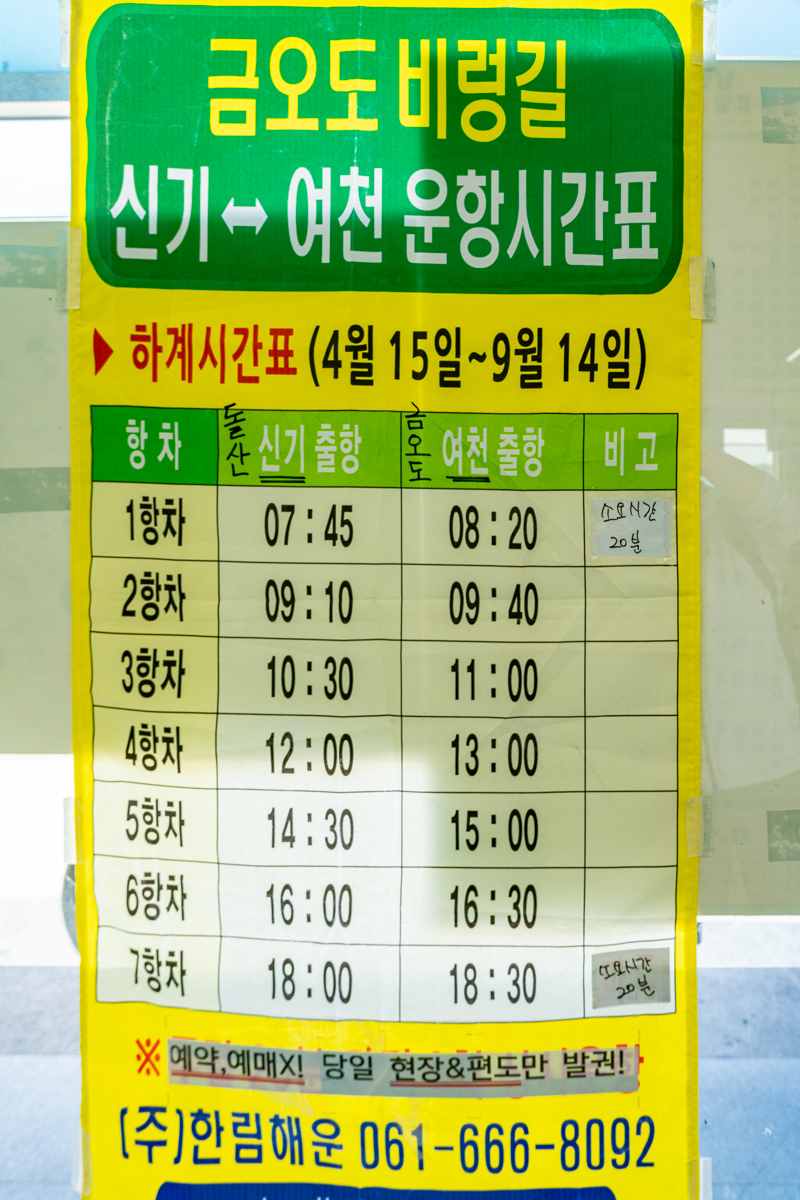 - 돌산도 신기선착장에서 금오도 여천선착장까지는 약 20분이 소요됩니다.