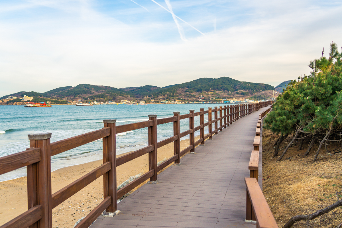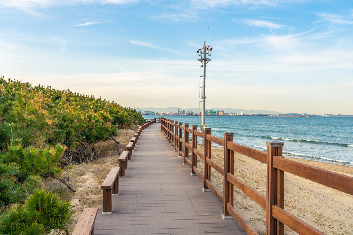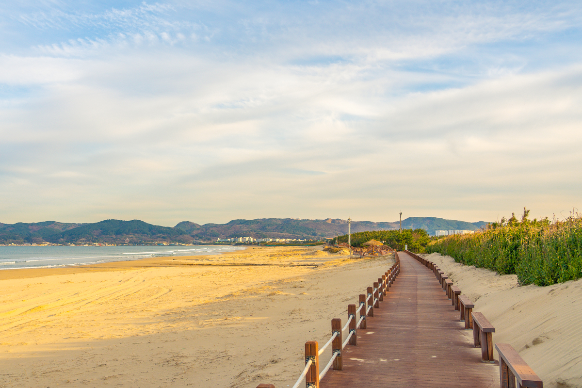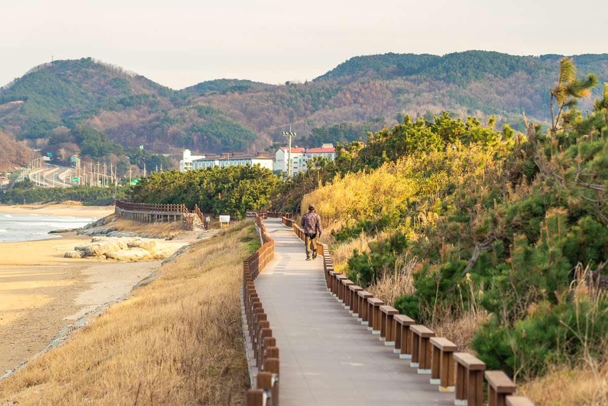 모래사장 위에서 힘겹게 걷지 않아도 괜찮았어요. 바로 옆에 목조 데크를 설치해 두었거든요. 잔잔한 바람과 일정한 간격으로 들려오는 파도 소리에 몸을 맡긴 채 편안하게 걸을 수 있었습니다. 공기가 포근했습니다. 어느덧 머리 위까지 솟아오른 태양이 온화한 공기를 선물해 주는 것만 같았어요. 발걸음이 가벼워지는 순간이었습니다.