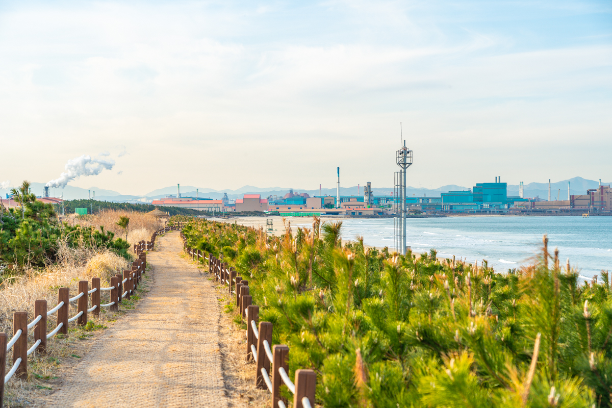 호미반도둘레길 1코스는 6.1km 길이로 이어집니다. 단숨에 걷기에는 곳곳에 쉬어갈 만한 시설이 많았습니다. 이국적인 느낌으로 장식해 둔 테이블이 가장 눈에 띄었는데요. 이곳에 앉아 멍하니 바다를 바라보는 게 참 좋았습니다. 해송으로 감싼 산책로 너머로는 포항의 공업 지대가 보이기도 했어요. 나름대로 흥미로운 풍경이었죠.