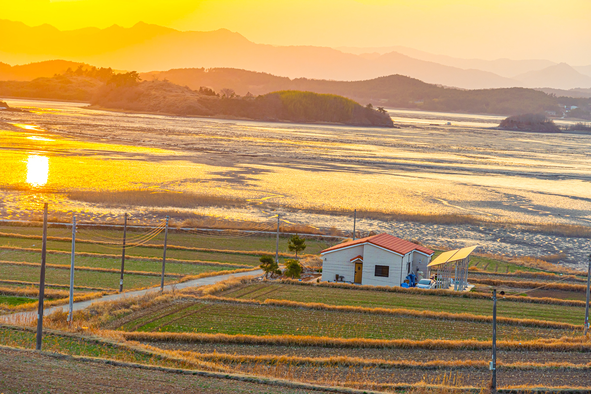 전망대에서 내려다보는 풍경은 말 그대로 황금빛 노을이 펼쳐지는 풍경으로, 계단식 논밭과 고독한 건물, 바다와 갯벌, 그리고 섬들의 군락까지가 아름다운 조화를 이룹니다. 특히 황혼 시간대에 방문하면 자연과 인간이 만들어낸 환상적인 풍경을 만나볼 수 있습니다. 이 시간대에는 세상이 황금빛으로 물들어 그림 같은 풍경이 펼쳐지는데, 이것을 경험하는 것만으로도 특별한 추억이 될 것입니다.
