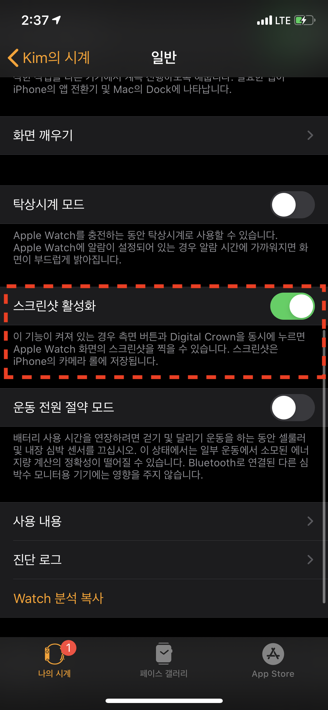 애플워치의 일반 설정 메뉴에서 '스크린샷 활성화' 버튼을 눌러 해당 기능을 켭니다. 아래 그림과 같이 하얀색 버튼이 오른쪽으로 이동하고, 초록색 배경이 보인다면 해당 기능이 켜진 겁니다.