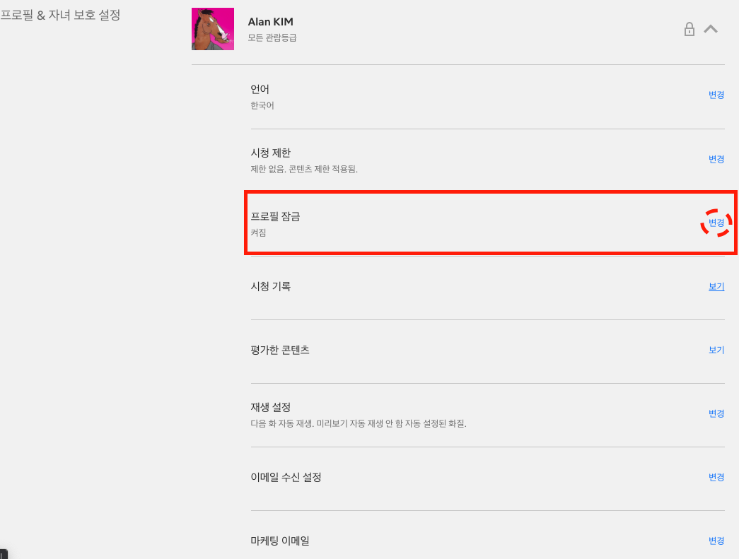 4. 본인의 프로필 하단에 등장한 메뉴 중, '프로필 잠금' 옆에 있는 '변경' 버튼을 클릭해 진입합니다.