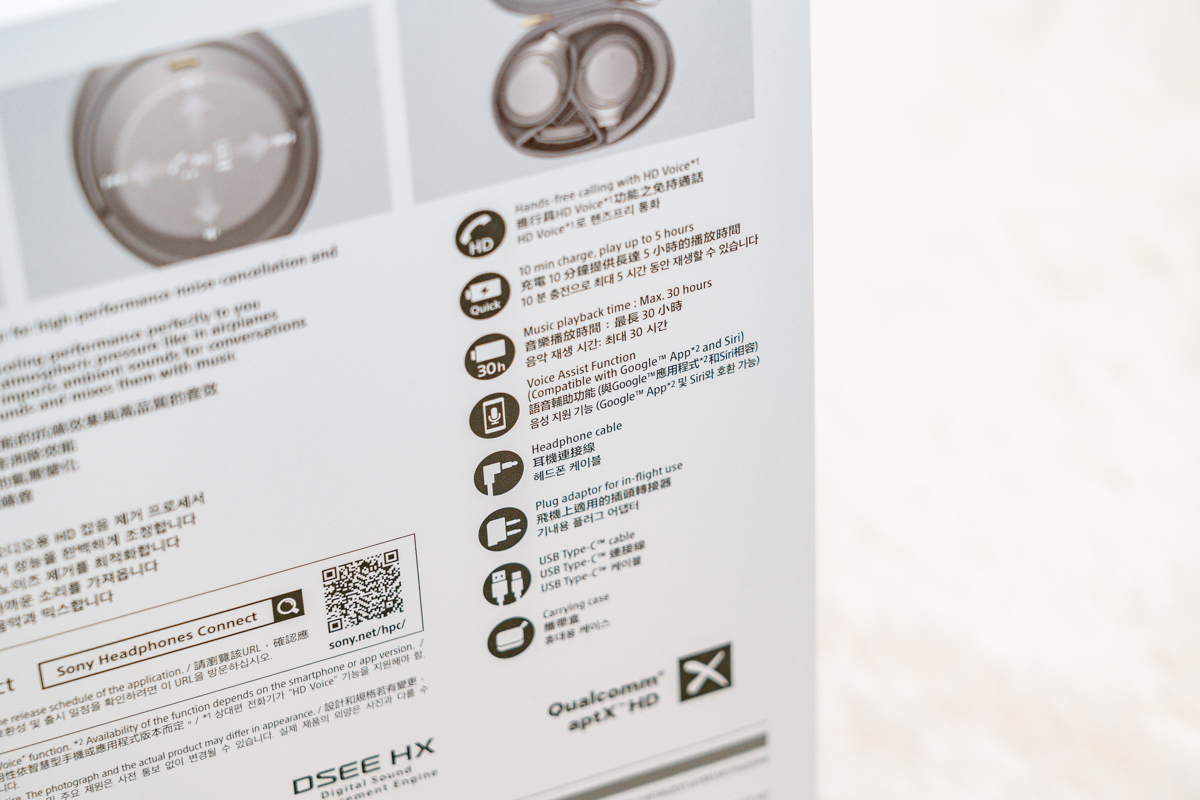 상자에 제품의 스펙이 표기되어 있습니다. 아무래도 대표적인 기능인 와이어리스(무선), 그리고 노이즈캔슬링이라는 단어가 제일 먼저 눈에 띄네요. 상자 후면에 노이즈캔슬링에 관한 설명이 상세히 적혀 있습니다. 상황에 따라 주변 소음을 제어해주는 프로세서가 탑재되었다는 이야기예요. 헤드셋이 주변 소음을 분석하고 최적의 환경을 제공해주기 위해 노력한다는 뜻이에요.